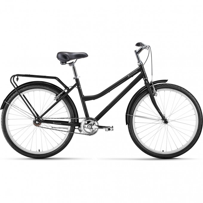 Надежная стальная рама. Универсальный велосипед в любых ситуациях: подойдет для любого члена семьи. В комплекте идет багажник, полноразмерные крылья, подножка, звонок. Данная модель с рамой 17 дюймов в черно-белом цвете.